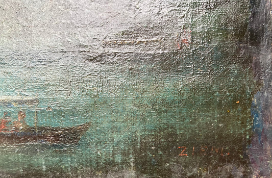Chinese artist Zieng Oil Painting: Waterscape with boat and mountains in the background