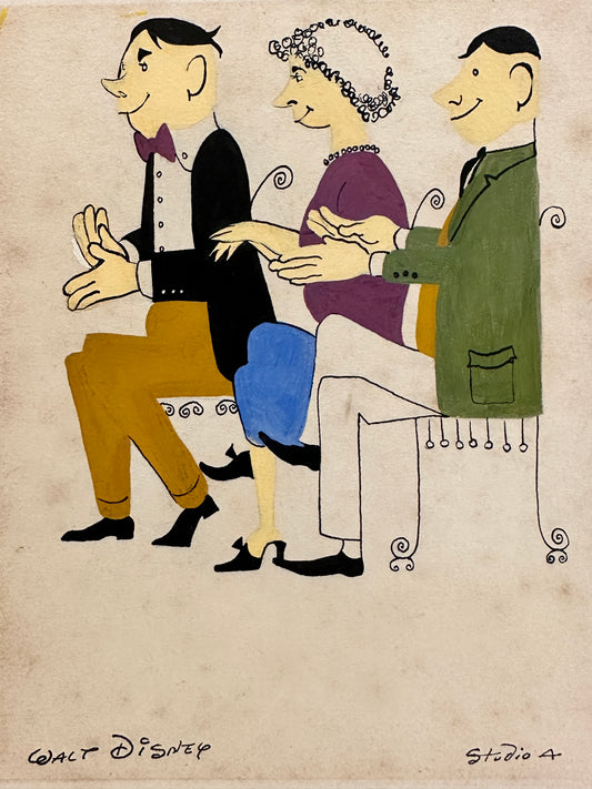 Walt Disney Signed Drawing: Three Seated Figures Applauding