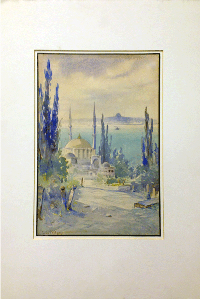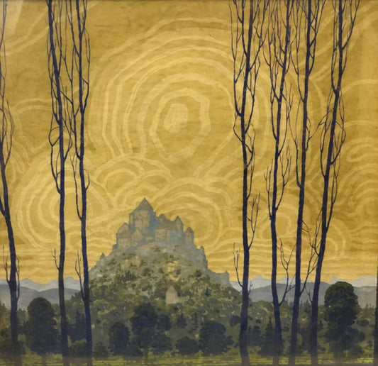 Castle in a Landscape with Yellow Skies Watercolor by artist JA (initials)