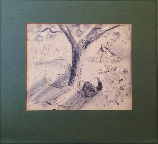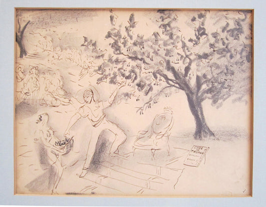 Marcel Vertes Drawing: A man picking a cerisier cherry