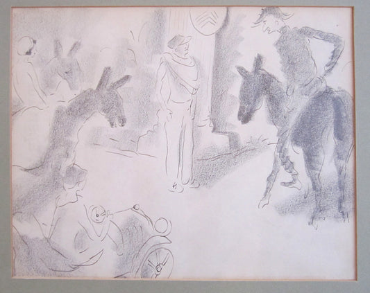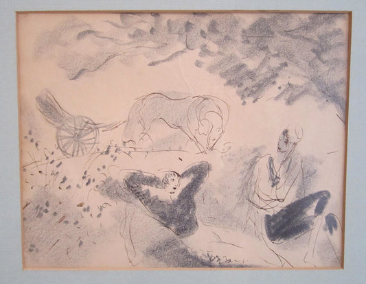 Marcel Vertes Drawing: Two figures and horse with carriage
