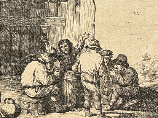 David Teniers II Etching: "Five Peasants Gathered around a Barrel"